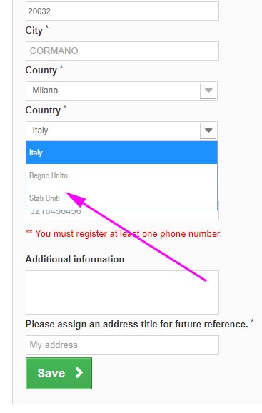 Andando nella compilazione indirizzi di un ordine, nel menu a tendina “Nazioni” (Country) il contenuto del menu rimane sempre in una sola lingua (guardare immagine).